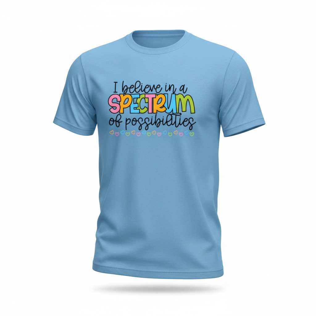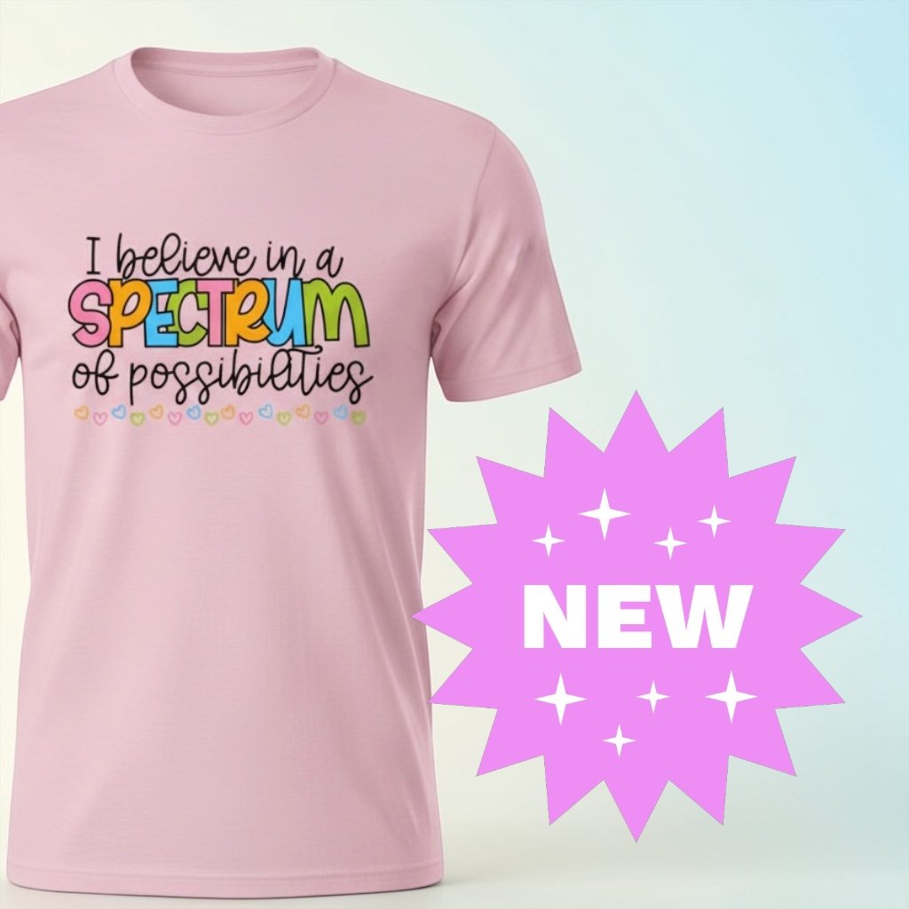 This soft pink tee spreads a powerful message of hope and belief—with bold, colorful lettering that celebrates the beauty of the spectrum and all the possibilities it brings. It’s bright, uplifting, and designed to spark conversations about acceptance, inclusion, and seeing the potential in everyone.